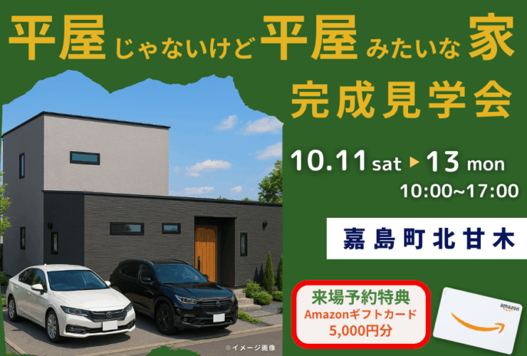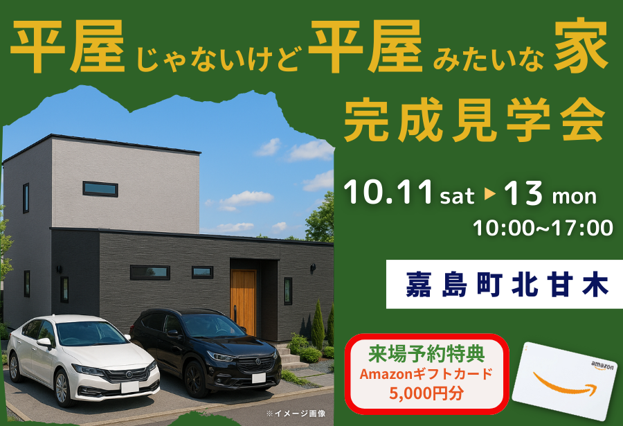 10月132025 平屋みたいな二階建て見学会@嘉島町 2025-10-13 10/11(土) ~ 13 (月・祝)の3日間、嘉島町にて「平屋みたいな二階建ての家」完成見学会を開催! 見学エントリー(特典5倍) >>> ご見学いただけるお家は29坪3LDK+畳スペースの間取り。【見どころPoint】①1階完結型の間取りで平屋的な暮らしも可能②生活感を隠せる多彩な収納計画③水回りをまとめた家事効率◎の動線 WEB予約でアマゾンギフト券 5,000円分プレゼント中! 見学エントリー(特典5倍) >>> どの世帯・どの世代でも魅力的な暮らしを実現できる平屋みたいな二階建て(※イメージパース) 27坪3LDKの平屋。 会場嘉島町北甘木(セブン-イレブン嘉島北甘木店車で約2分) お問い合わせ先096-334-8410(ジャストホーム) 期間2025年10月11日(土)~13日(月・祝) 注意事項 ※アマゾンギフト券(または、QUOカード)の進呈はジャストホーム(または、ブエラハウス)へ新規ご来場の方に限ります。 ※アマゾンギフト券(または、QUOカード)の進呈は熊本県内で新築をご計画中の方に限ります。 ※ご来場予定の前日18時までにWEBよりご予約をいただいた場合に限ります。 ※ブエラハウスで期間中に特典を受け取られた方は対象外となります。 ※枚数に限りがございます。なくなり次第終了となります。ご了承ください。 ※本キャンペーンは(株)ジャストホームによる提供です。本キャンペーンについてのお問い合わせはAmazonではお受けしておりません。(株)ジャストホーム(jst.info@searshomegroup.co.jp)までお願いいたします。 ※Amazon、Amazon.co.jpおよびそれらのロゴはAmazon.com, Inc. またはその関連会社の商標です。 現地へのアクセス 「見学会会場」合志市栄 見学エントリー(特典5倍) >>>