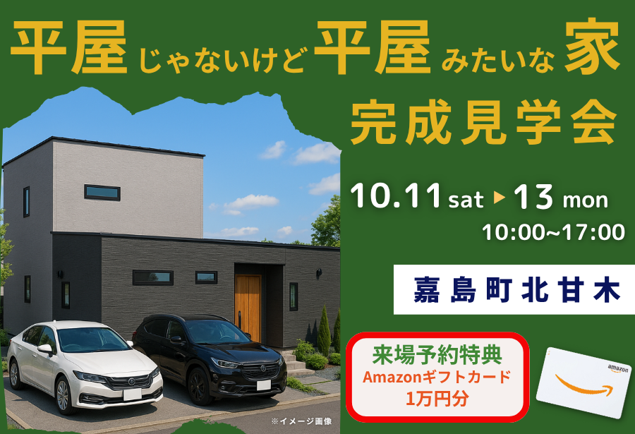 10月132025 平屋みたいな二階建て見学会@嘉島町 2025-10-13 10/11(土) ~ 13 (月・祝)の3日間、嘉島町にて「平屋みたいな二階建ての家」完成見学会を開催! 見学エントリー(特典10倍) >>> ご見学いただけるお家は29坪3LDK+畳スペースの間取り。【見どころPoint】①1階完結型の間取りで平屋的な暮らしも可能②生活感を隠せる多彩な収納計画③水回りをまとめた家事効率◎の動線 WEB予約でアマゾンギフト券 5,000円分プレゼント中! 見学エントリー(特典10倍) >>> どの世帯・どの世代でも魅力的な暮らしを実現できる平屋みたいな二階建て(※イメージパース) 27坪3LDKの平屋。 会場嘉島町北甘木(セブン-イレブン嘉島北甘木店車で約2分) お問い合わせ先096-334-8410(ジャストホーム) 期間2025年10月11日(土)~13日(月・祝) 注意事項 ※アマゾンギフト券(または、QUOカード)の進呈はジャストホーム(または、ブエラハウス)へ新規ご来場の方に限ります。 ※アマゾンギフト券(または、QUOカード)の進呈は熊本県内で新築をご計画中の方に限ります。 ※ご来場予定の前日18時までにWEBよりご予約をいただいた場合に限ります。 ※ブエラハウスで期間中に特典を受け取られた方は対象外となります。 ※枚数に限りがございます。なくなり次第終了となります。ご了承ください。 ※本キャンペーンは(株)ジャストホームによる提供です。本キャンペーンについてのお問い合わせはAmazonではお受けしておりません。(株)ジャストホーム(jst.info@searshomegroup.co.jp)までお願いいたします。 ※Amazon、Amazon.co.jpおよびそれらのロゴはAmazon.com, Inc. またはその関連会社の商標です。 現地へのアクセス 「見学会会場」合志市栄 見学エントリー(特典10倍) >>>
