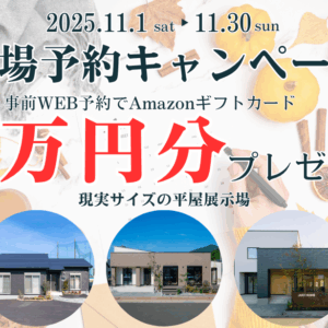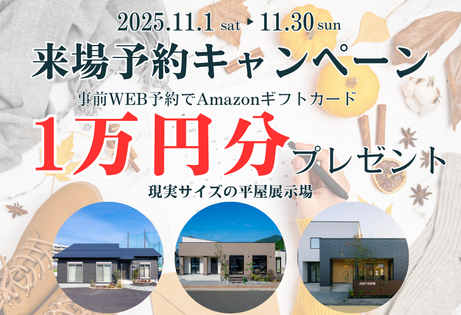 11月302025 【11月限定】来場予約キャンペーン!Amazonギフトカード1万円分プレゼント! 2025-11-30 WEB予約でAmazonギフトカード1万円分プレゼント!来場予約キャンペーン 【11月限定】11月限定の来場予約キャンペーンを開催します。ジャストホームへはじめてご来場の方へ、WEB予約でアマゾンギフト券1万円分をプレゼント!熊本市南区・平屋住宅展示場、合志市・平屋住宅展示場、八代市・平屋住宅展示場、ブエラハウスの嘉島住宅展示場が対象会場です!詳細はキャンペーン概要をご覧ください。 H3見出しa 見学エントリー >>> キャンペーン概要 名称【11月限定】来場予約キャンペーン! 期間2025年11月1日(土)〜11月30日(日) 対象会場熊本の平屋住宅展示場(ゆめタウンはません近く) 合志の平屋住宅展示場(KKT合志総合住宅展示場内) 八代の平屋住宅展示場(熊日八代住宅展内) ブエラハウス嘉島住宅展示場(イオンモール熊本そば) 内容詳細事前にWEB来場予約の上、所定の条件を満たすと、1万円分のAmazonギフト券をプレゼント。 <新規ご来場の方限定> ・事前にWEB来場予約でAmazonギフト券(または、QUOカード)1万円分をプレゼント。 ※ ご予約完了後、WEBアンケートのご回答が必須条件となります 注意事項 ※アマゾンギフト券(または、QUOカード)の進呈はジャストホーム(または、ブエラハウス)へ新規ご来場の方に限ります。 ※アマゾンギフト券(または、QUOカード)の進呈は熊本県内で新築をご計画中の方に限ります。 ※ご来場予定の前日18時までにWEBよりご予約をいただいた場合に限ります。 ※ブエラハウスで期間中に特典を受け取られた方は対象外となります。 ※枚数に限りがございます。なくなり次第終了となります。ご了承ください。 ※本キャンペーンは(株)ジャストホームによる提供です。本キャンペーンについてのお問い合わせはAmazonではお受けしておりません。(株)ジャストホーム(jst.info@searshomegroup.co.jp)までお願いいたします。 ※Amazon、Amazon.co.jpおよびそれらのロゴはAmazon.com, Inc. またはその関連会社の商標です。 熊本市南区田迎町、合志市竹迫、八代市上片町、上益城郡嘉島町のモデルハウスが対象の住宅展示場です。キャンペーン期間に、ぜひ、家づくりの参考になるモデルハウスへお越しください。