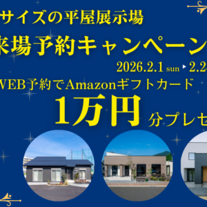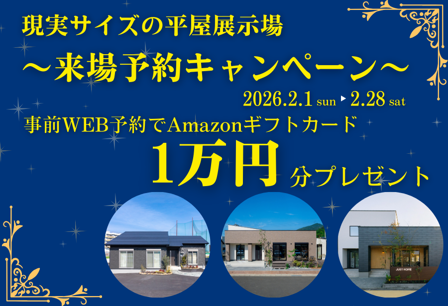 【2月限定】2月も来場予約キャンペーンを開催!ジャストホームへはじめてご来場の方へ、事前WEB予約の上、ご来場でAmazonAmazonギフト券1万円分をプレゼント!熊本市南区・平屋住宅展示場、合志市・平屋住宅展示場、八代市・平屋住宅展示場、ブエラハウスの嘉島住宅展示場が対象会場です!詳細はキャンペーン概要をご覧ください。